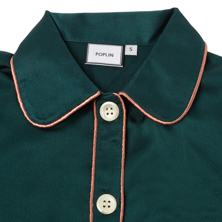 £249.00This sophisticated new style pairs a longer length pyjama shirt with slightly tapered trousers. Wear the shirt alone as an alluring short nightshirt or together with the trousers for a flattering, Indian-inspired silhouette. Opulent emerald silk with a jewel pink piping.